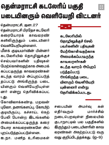 கடற்கரை பாதுகாப்பு சட்டத்தின் படி கடலிலிருந்து 200 மீற்றர் தூரத்திற்குள் மக்கள் குடியிருக்க முடியாது. எனவே அப் பகுதிக்குள் வசிப்பவர்களுக்கு வேறு பிரதேசங்களில் காணிகள் வழங்கப்படும். 200 மீற்றருக்கு அப்பால் வசிப்பவர்களுக்கு மட்டும் அந்த இடங்கள் சொந்தமாக வழங்கப்படும். மேலும் இப் பிரச்சினை தொடர்பாக உரிய அதிகாரிகளுக்கு தெரிவித்து நடவடிக்கை எடுக்கப்படும் என உறுதியளித்ததையடுத்து மக்கள் ஆர்ப்பாட்டத்தைக் கைவிட்டனர்.